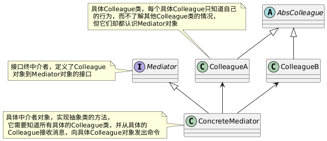 | 中介者 | 通过一个中介类来处理两个类之间的信息交换 |