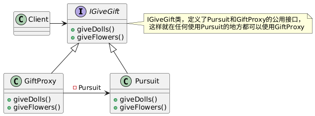 note right: IGiveGift类,定义了Pursuit和GiftProxy的公用接口,\n 这样就在任何使用Pursuit的地方都可以使用GiftProxy