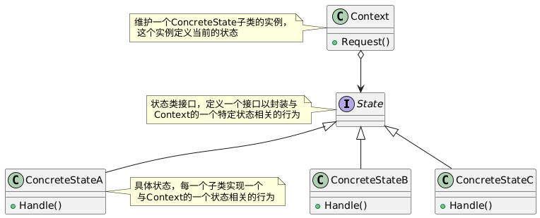 | 状态 | 多个大致相同的类,只是状态不同,随着不停的调用 一个状态会转为另一个状态(一个类转为另一个类) |