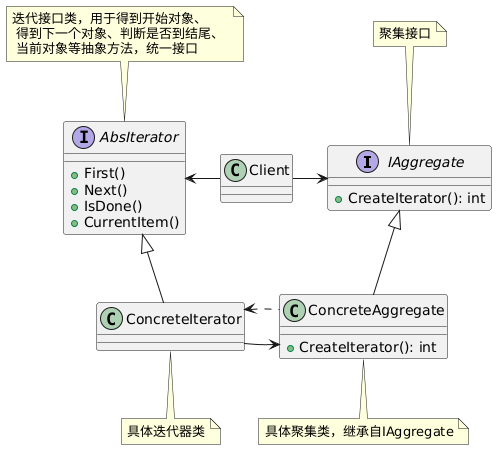 | 迭代器 | 分离了集合对象的遍历行为,抽象出一个迭代器类来负责。解决遍历问题 |