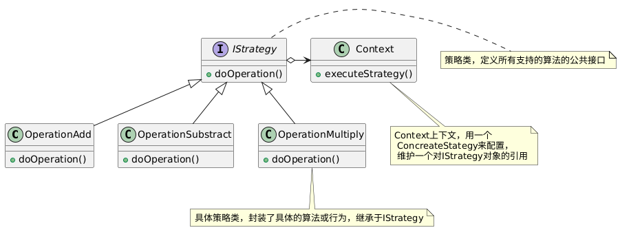 | 策略 | 算法、规则的封装、传入具体调用,调用具体算法 |