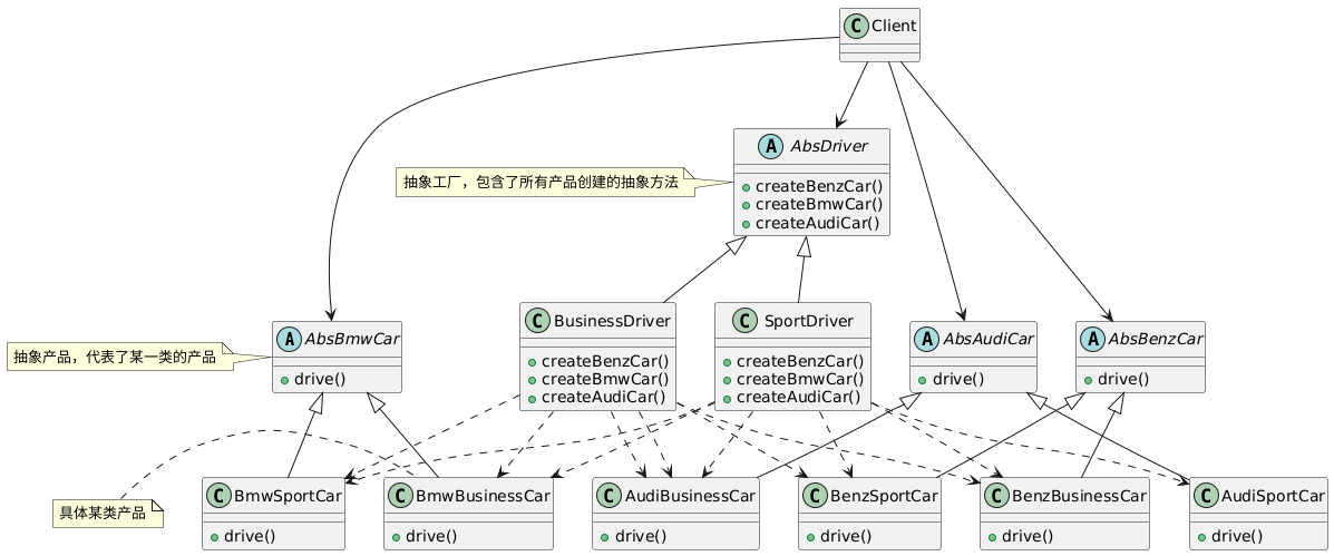 | 工厂方法 | 创建类,一个实现类要有一个工厂类 总是通过对应的工厂类创建实现类,判断在客户端进行。工厂类太多。 |